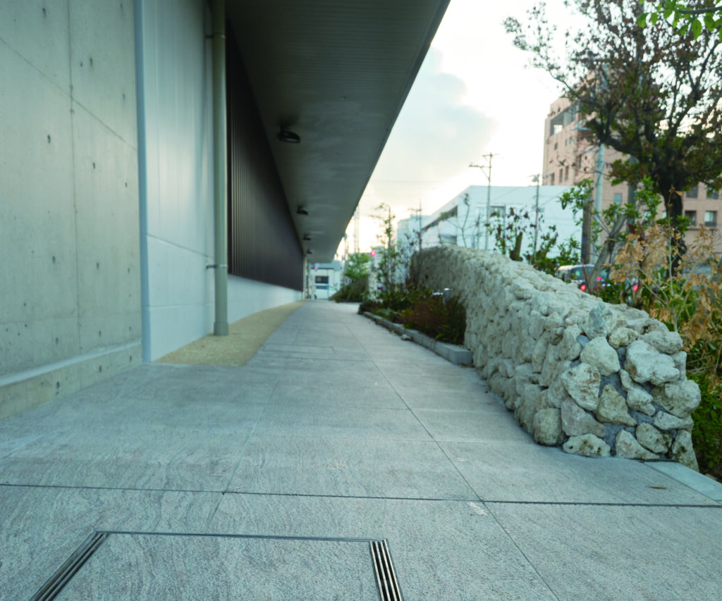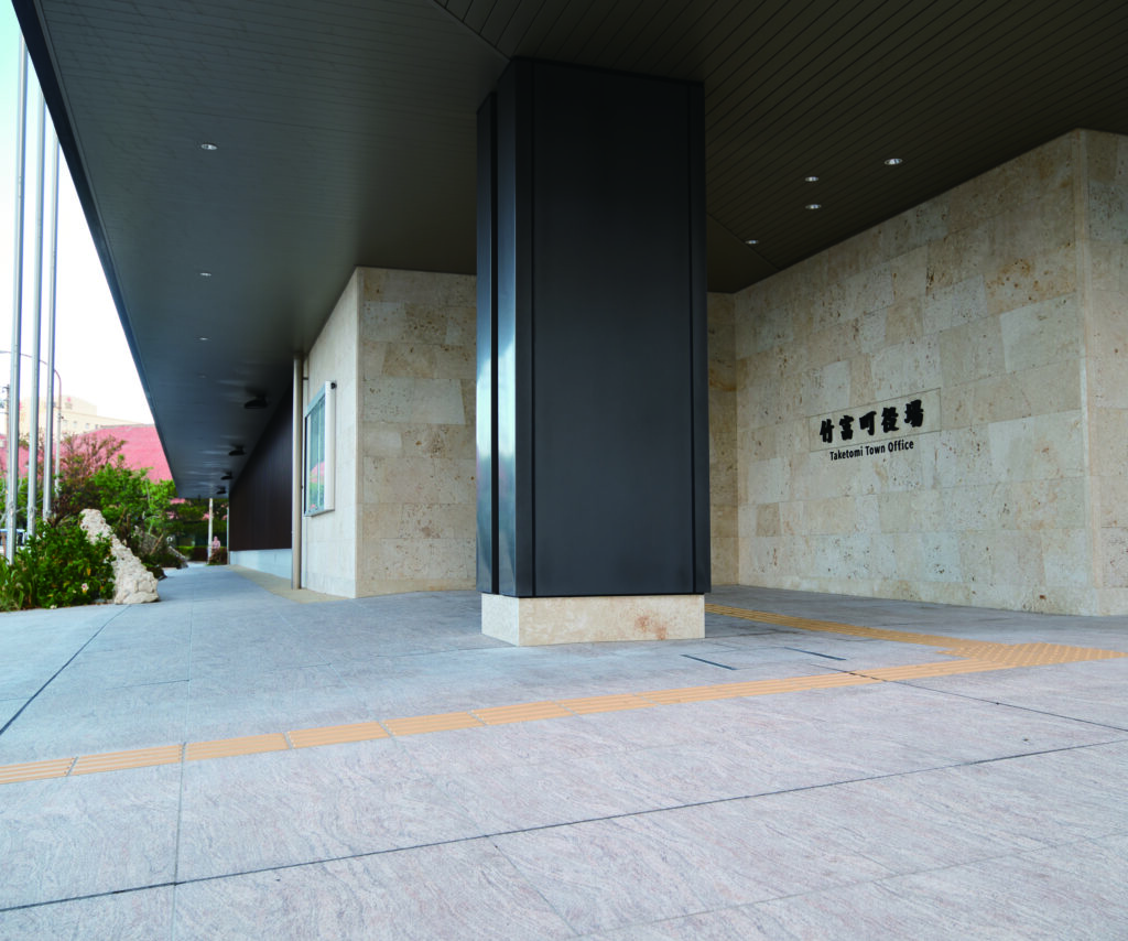 沖縄県八重山郡竹富町の町役場。公共施設らしく控えめな色合いと雰囲気が特徴的です。ここにも、グラン舗石のティーダが使われています。少し赤みがかったベージュが美しい、SL4番です。フォーマルな雰囲気を保ちながらも、大胆な意匠により、少し特別感のある空間に仕上がっています。