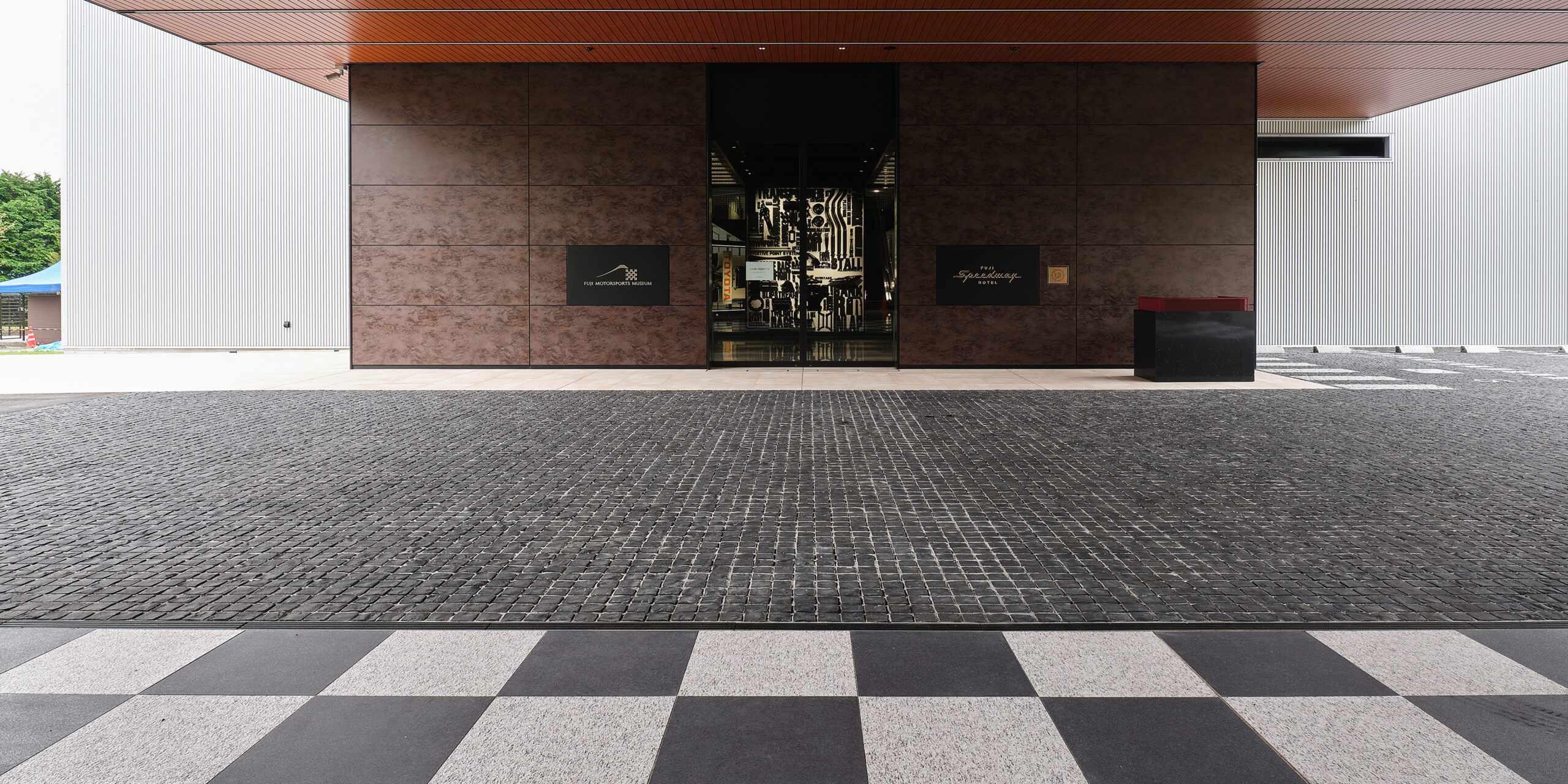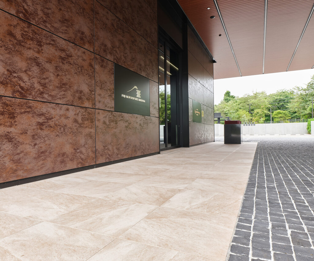 「国際サーキットである富士スピードウェイに隣接し、富士山の絶景を楽しめるラグジュアリーホテル」(公式HPより引用)に、グラン舗石が使われています。車寄せにもなっているエントランス部分に使われているのが、「ルイーダ」のE02番。ルイーダは、スレート石の表情が荒々しくも神々しいタイルです。ゴージャスな壁と合わさり、高級感を醸し出しています。