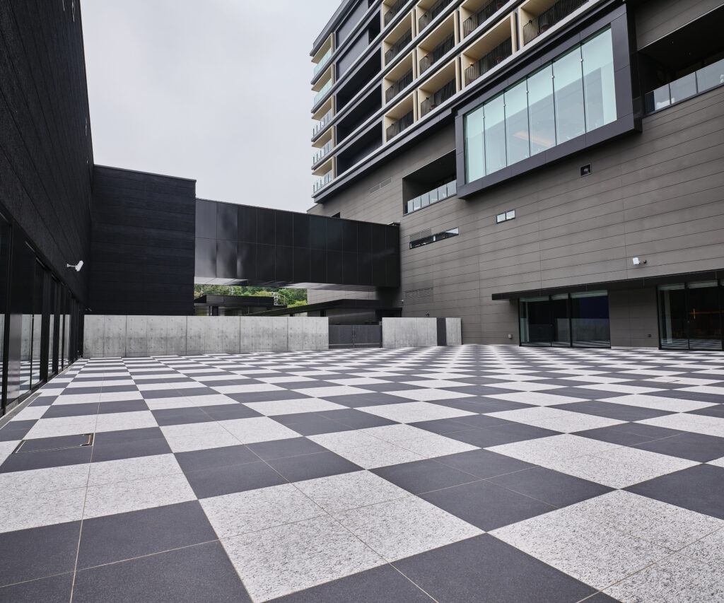 更に、建物の内側、広場のような空間には、御影石の流れ模様を表現した「ティーダ」のSL2番、および、グラニットスタイルの黒が特徴的な「ランダ」のE04番が使われています。大胆なチェックパターンが、ホテルのインパクトを強めています。