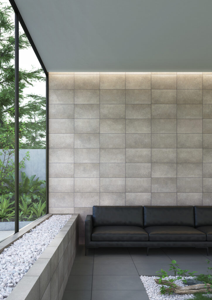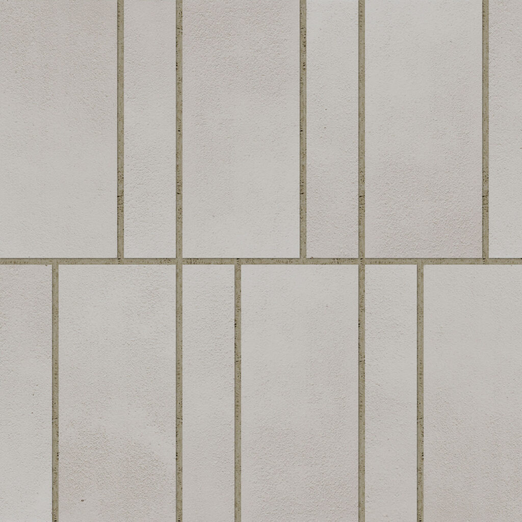 シンプルな表情を持つ、小ぶりな湿式タイル。粘土ゆえの揺らぎと組み合わせのリズムが、“土もの”の奥深さを引き立てます。マンションのエントランスや低層部にも、戸建住宅の外壁としてもお勧めです。
