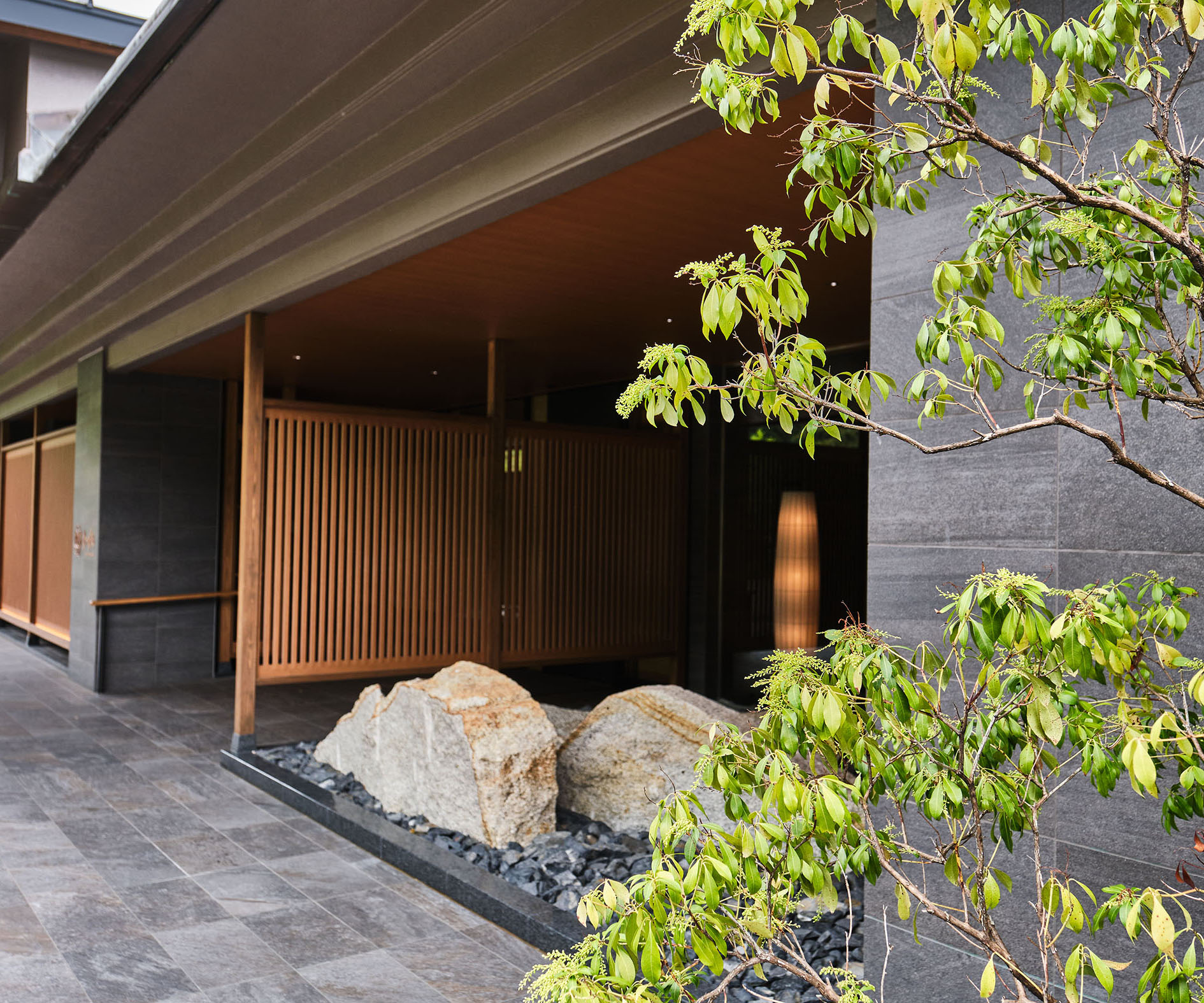 外装壁に使われているのは、600×300サイズ。和の雰囲気に異国情緒をプラスしています。木材や植木との親和性も高く、深みのあるテイストに仕上がっています。