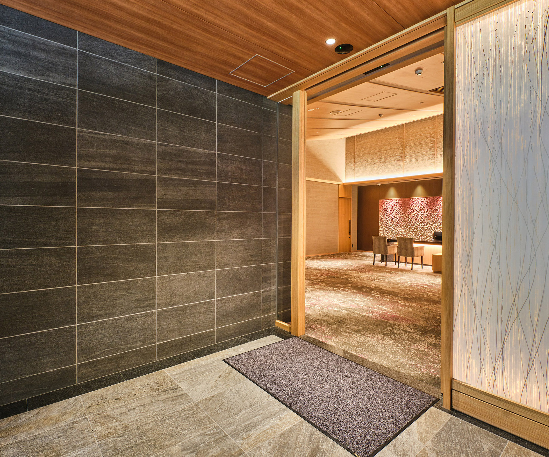 内装壁にも、同じく600×300サイズが使用されています。あたたかな照明に包まれ、外装よりもどこか優しさを帯びてなお、失われることのない風格。