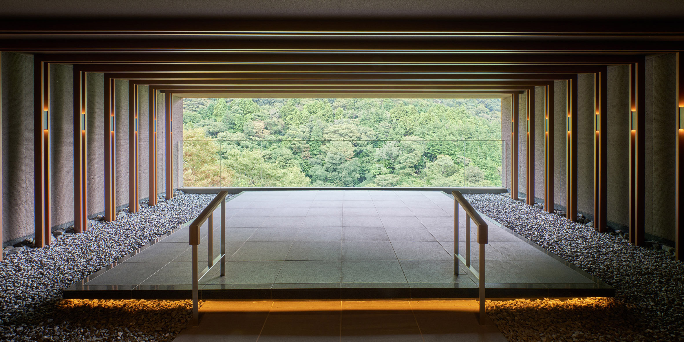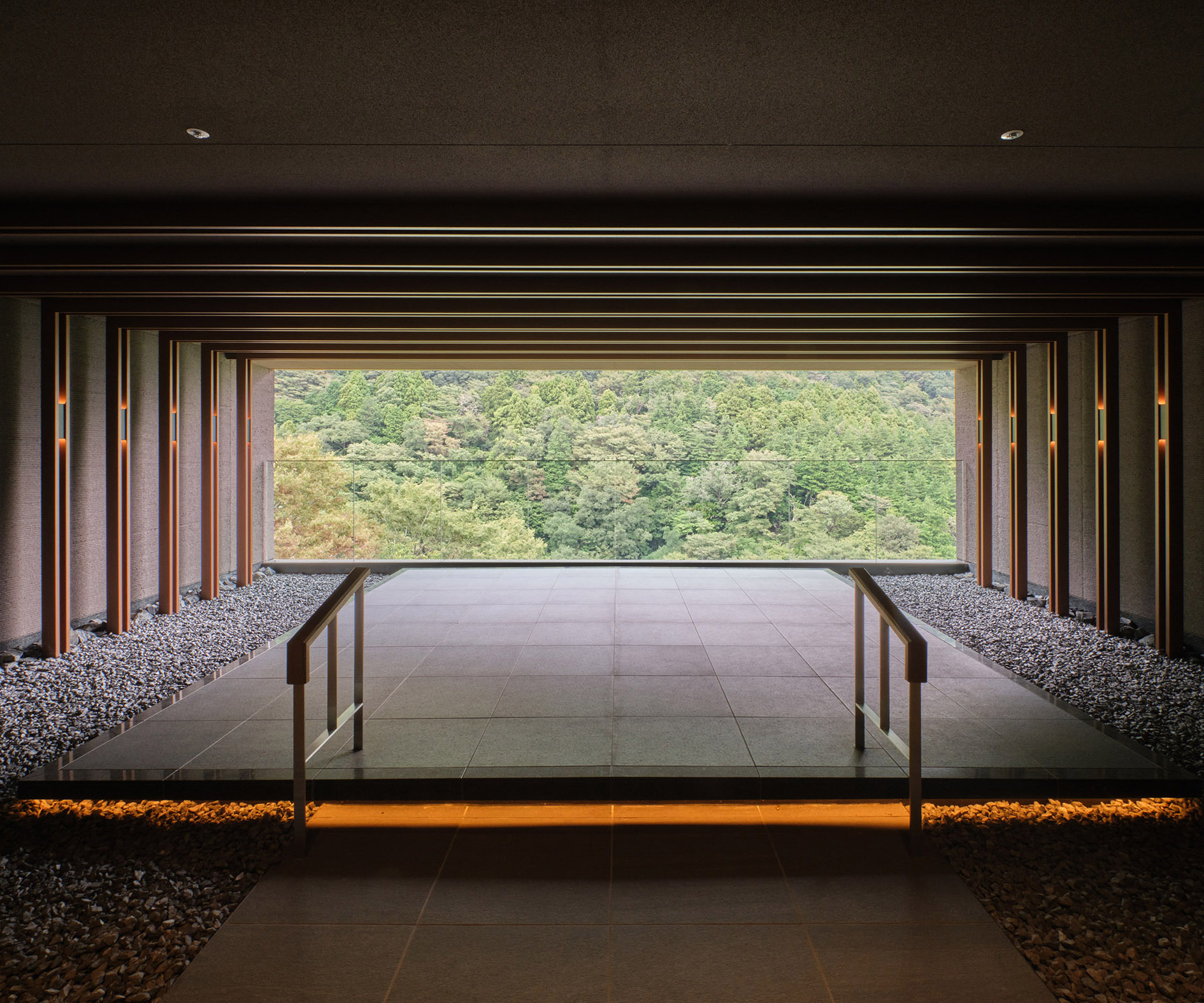印象的な展望デッキの床部分には、広々と使われた600角サイズ。大自然を切り取ったかのような情景を損なうことなく、空間に溶け込んでいます。