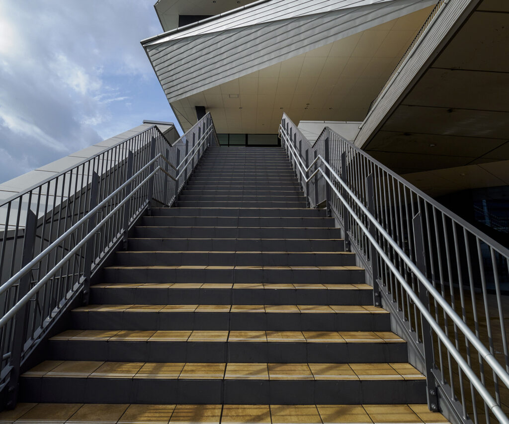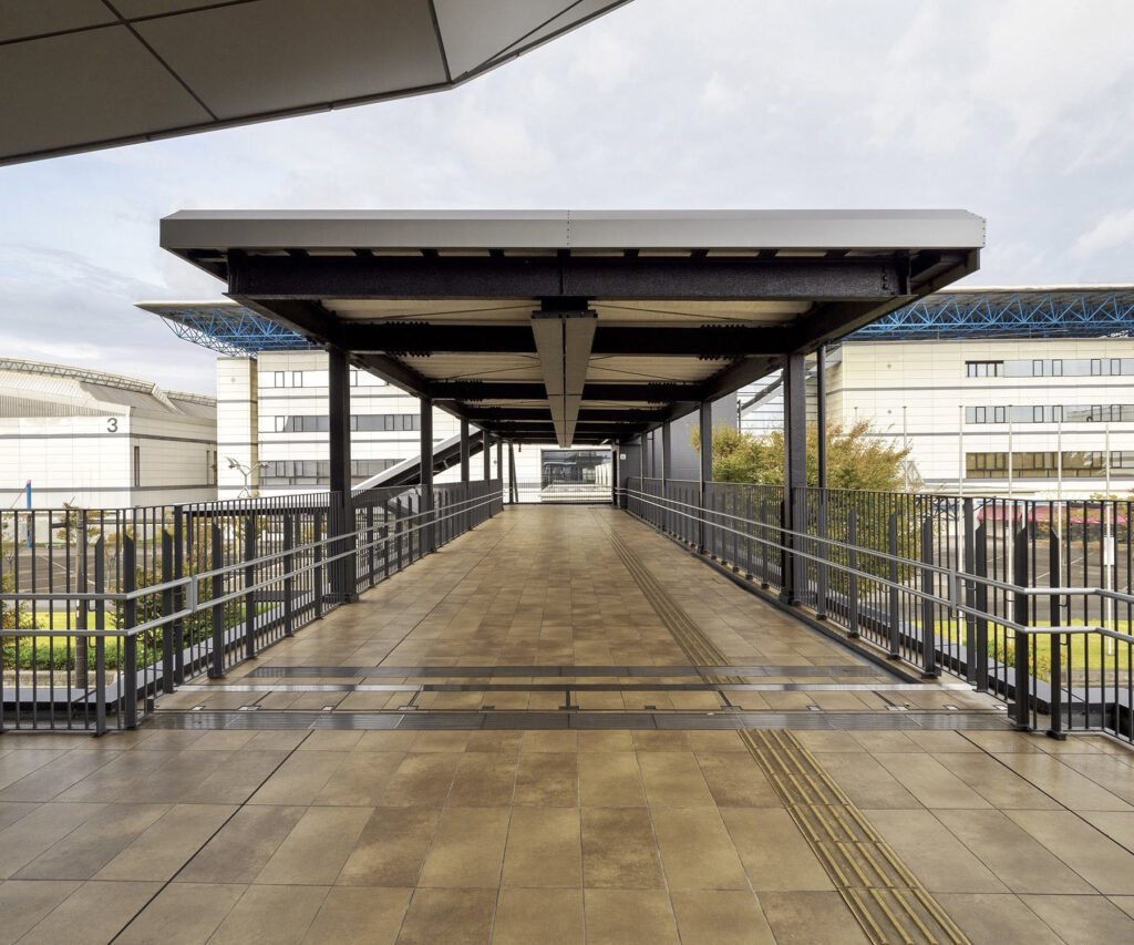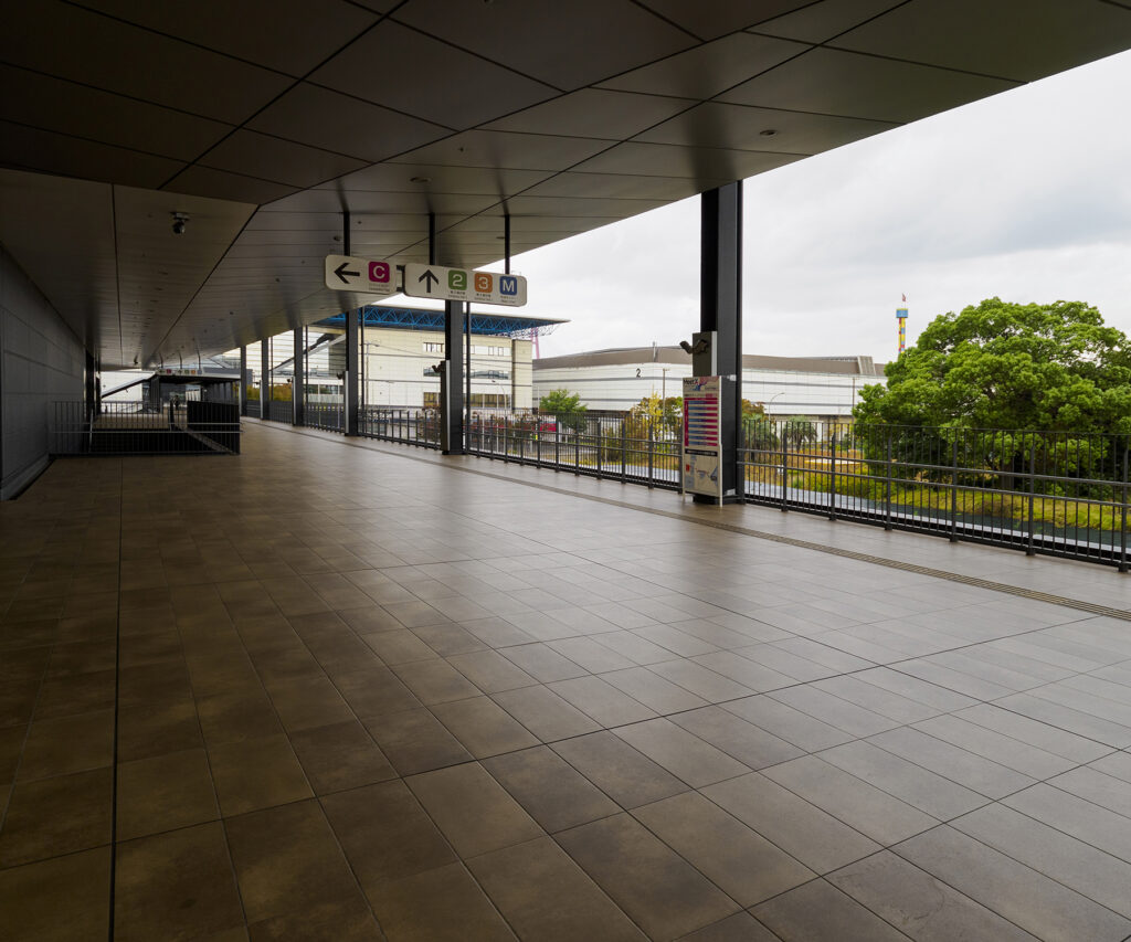 建物に目を向けると、種々の分野の最先端・トレンドが集うにふさわしい、モダンでアグレッシブなデザインが特徴的です。そんなポートメッセなごやの、コンベンションセンター及びそれに連なる通路に、アイコットリョーワのタイルが使われています。