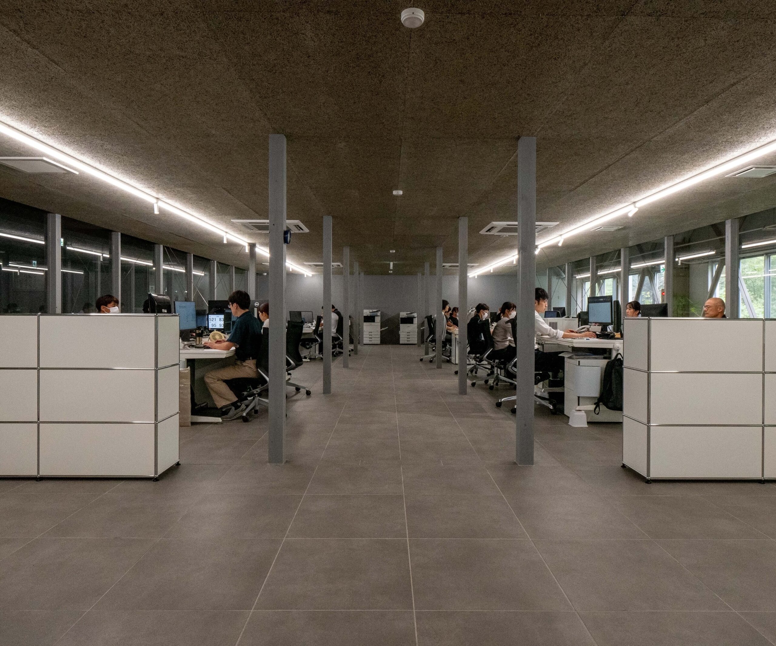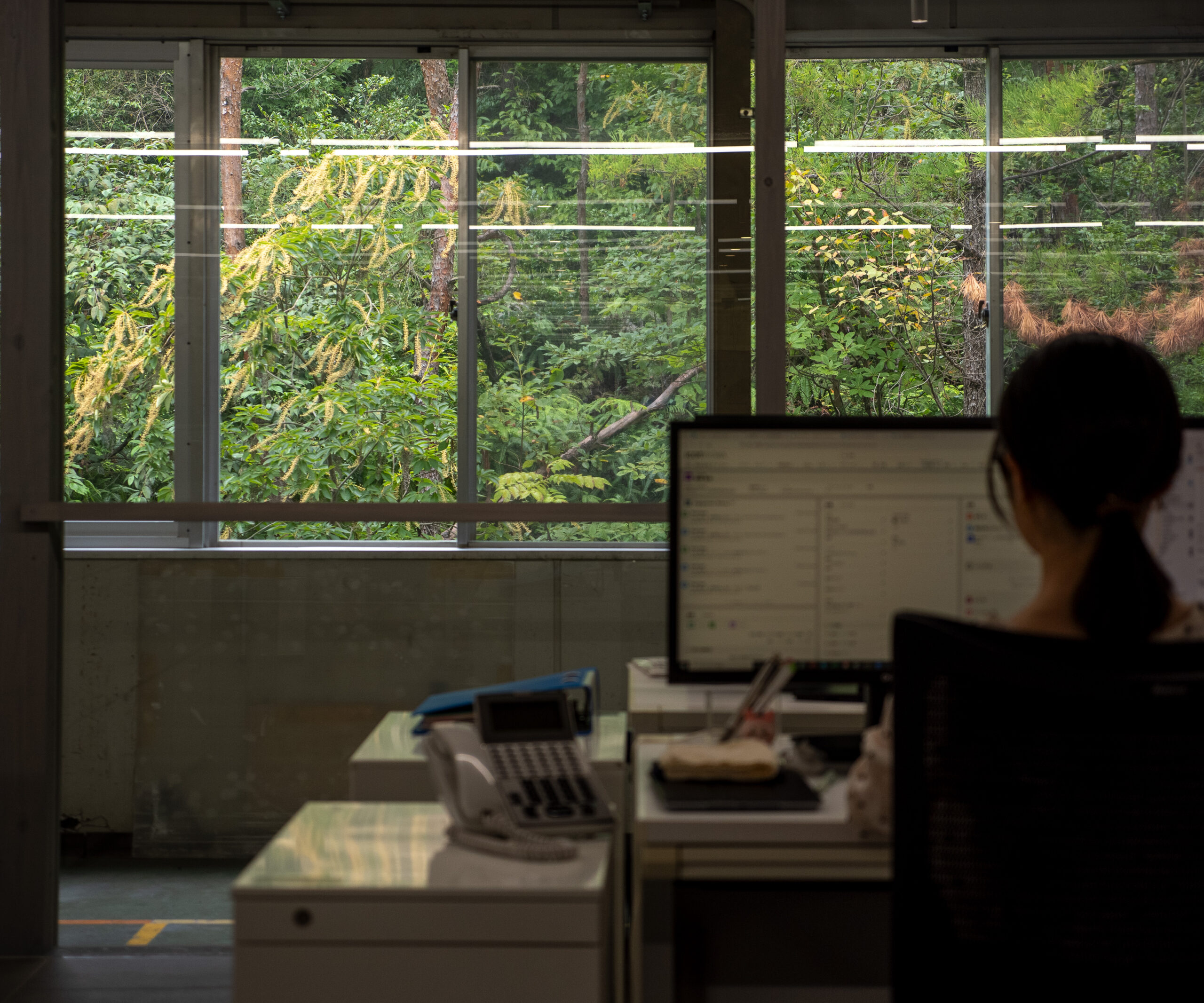 窓の外に視線をやると、山林の中という立地ならではの美しい木々が。画面と向き合う社員にとっては、極上の目の癒しとなっています。