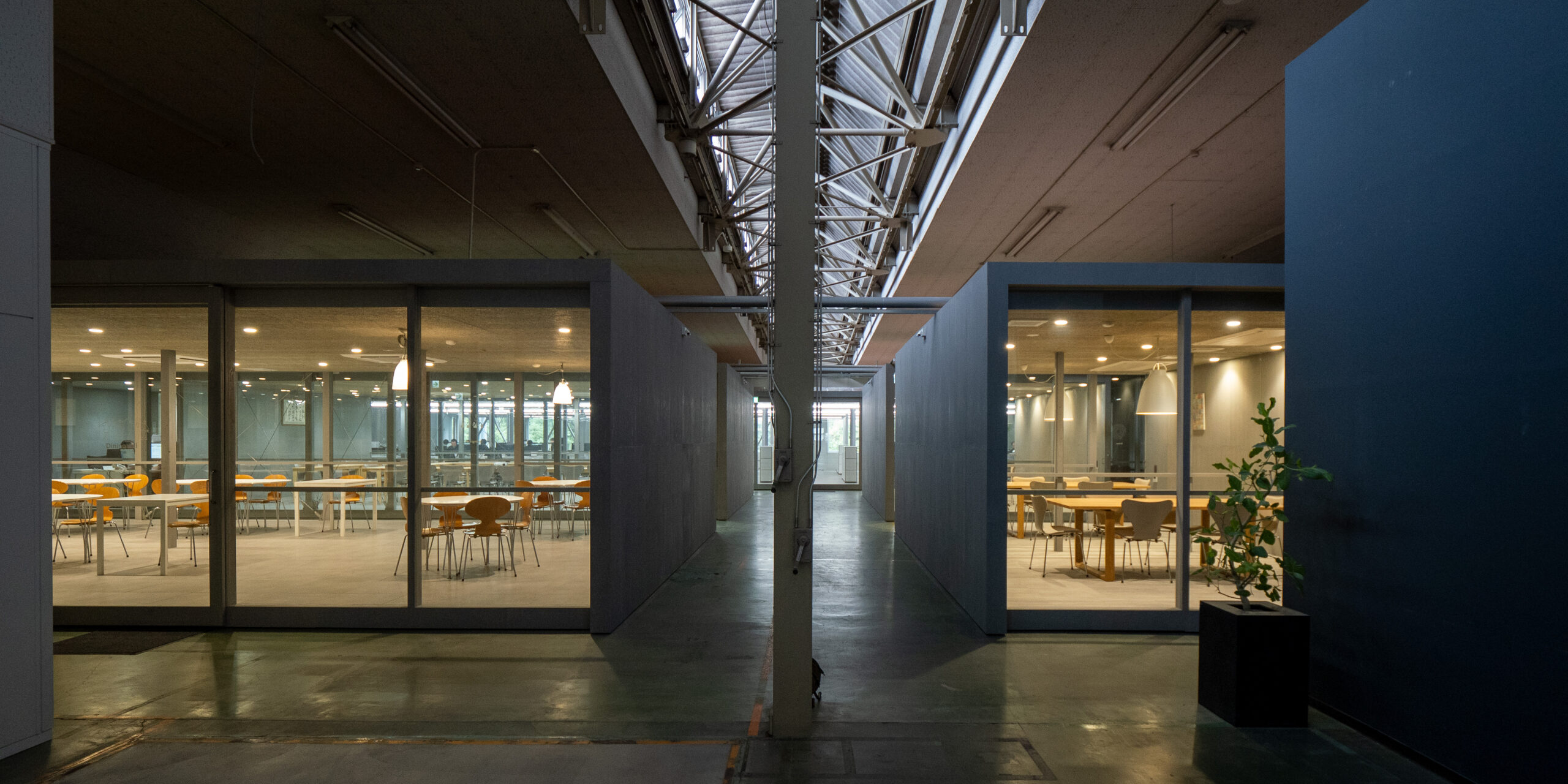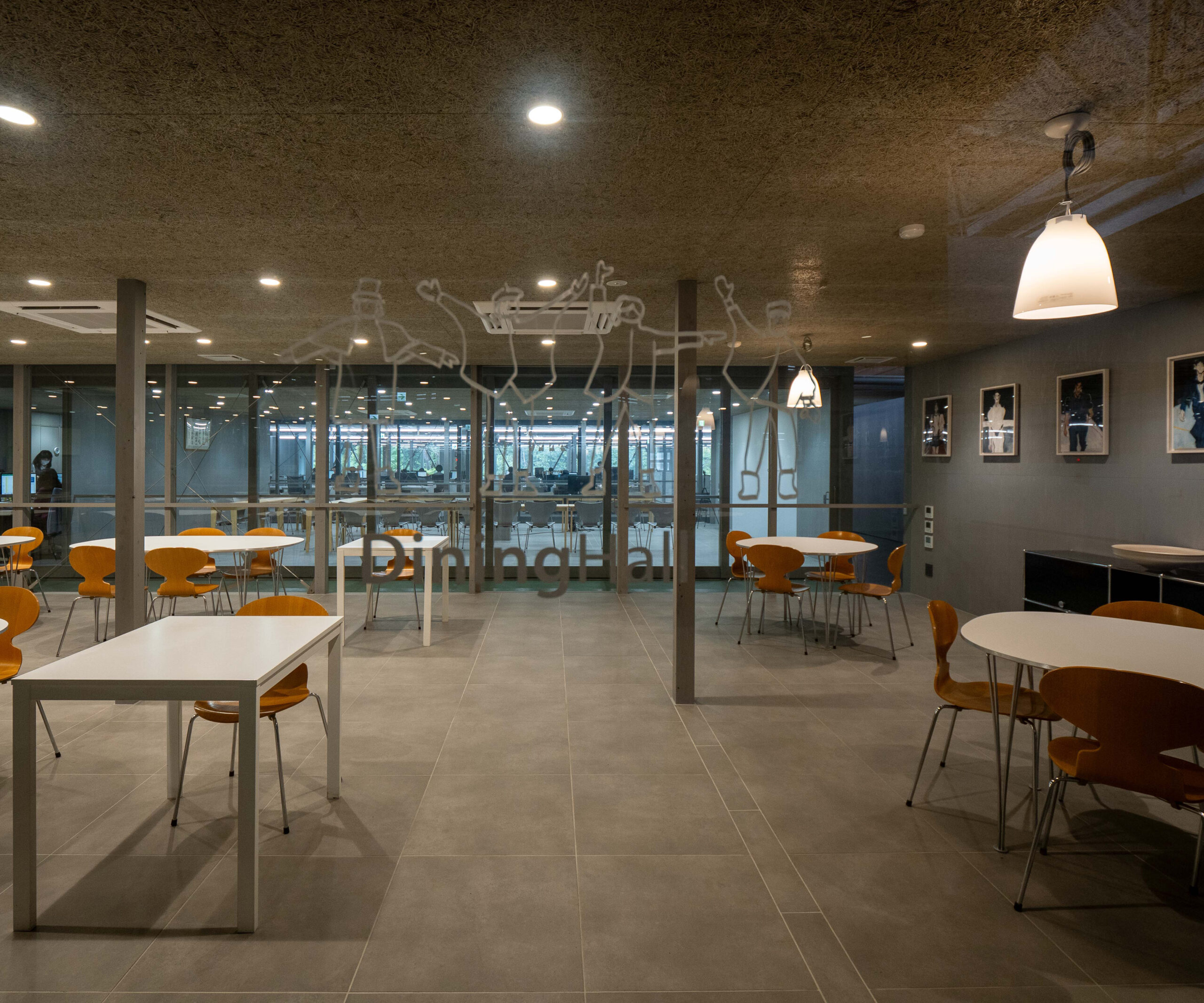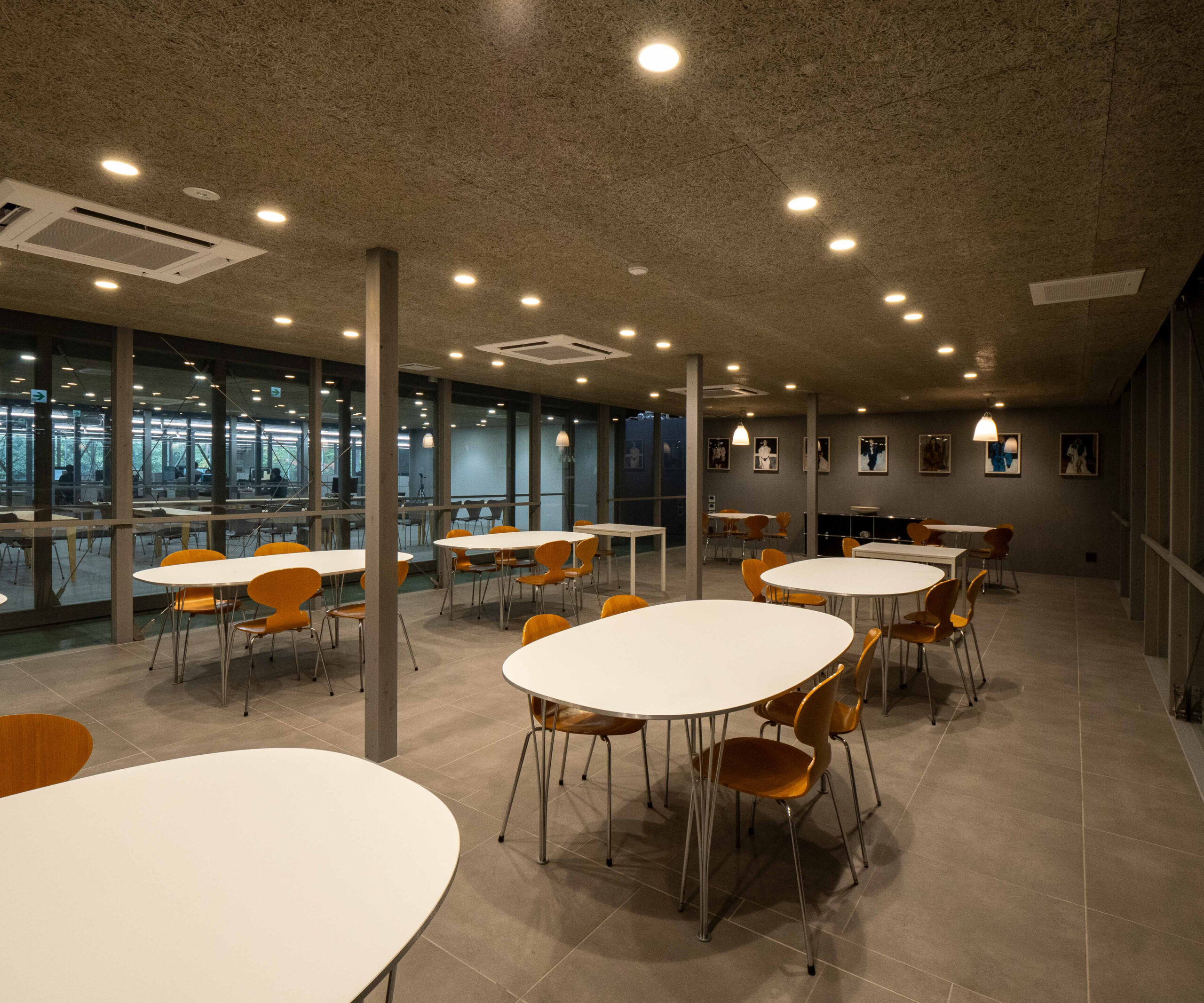 最後に食堂をご紹介します。いくつも設置されたテーブルは、同じくFRITZ HANSENの「Superellipse」。事務所と同じ床タイル「ナバラ」が張られ、シックながら食事の場にふさわしい明るさを感じさせます。