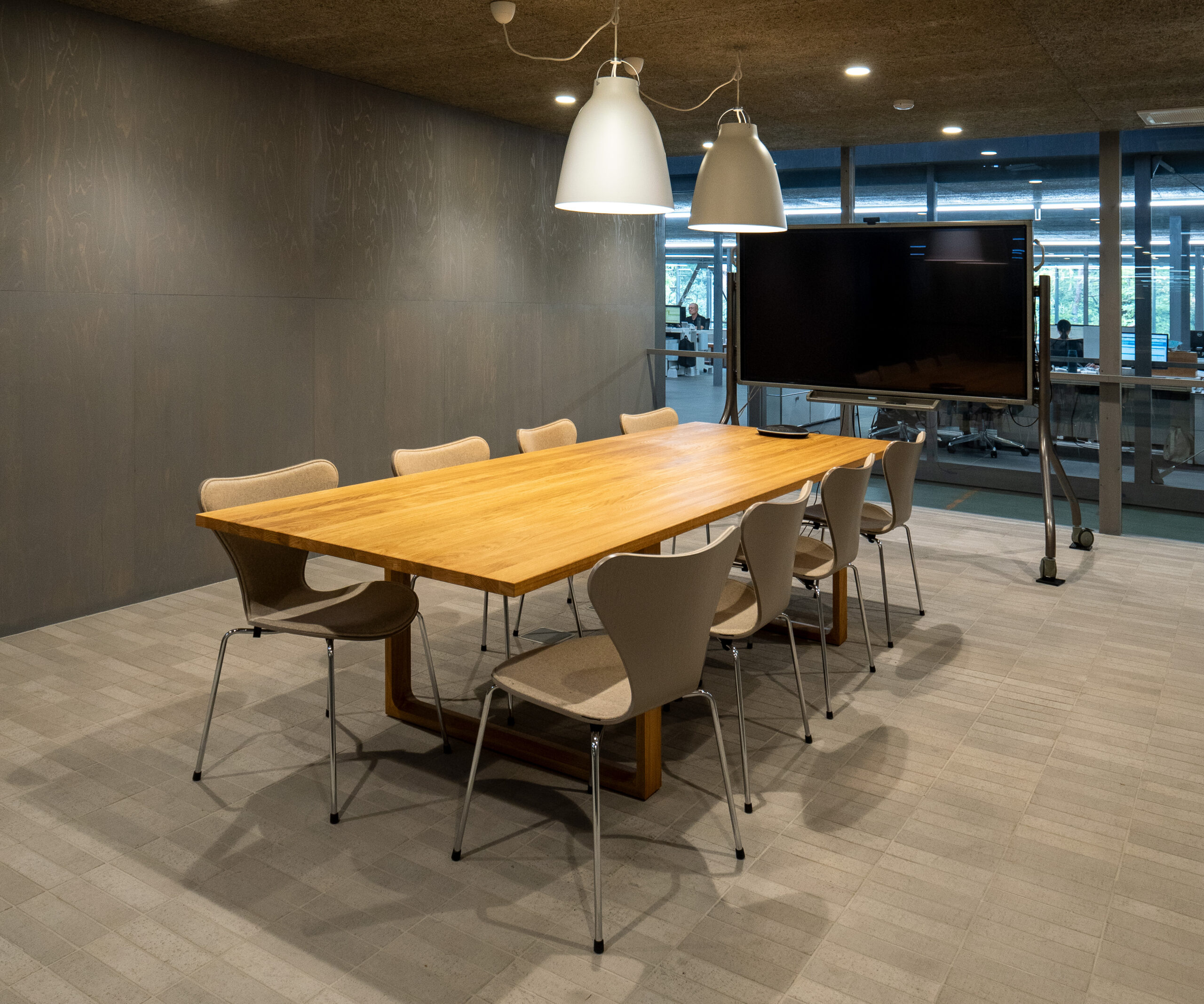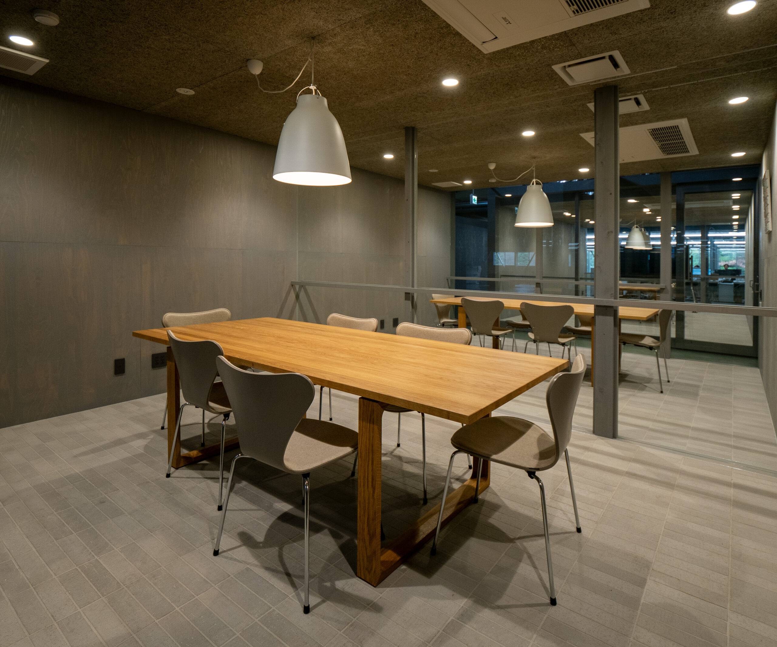 続いてはミーティングルームのご紹介です。全体的にグレートーンの印象が強い部屋となっており、こちらの柱や壁にも、事務所と同じく「東濃ひのき」が使われています。また、家具はFRITZ HANSENの「エッセイテーブル」と「セブンチェア」。使い心地もデザインも抜群で格別に過ごしやすいミーティングルームとなっています。