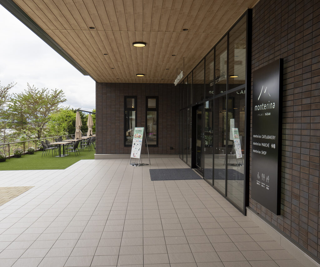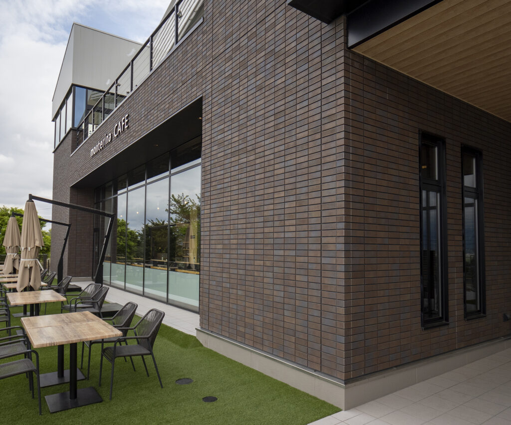 お客様を迎えるかのような木々の並ぶ花壇に、ガーデン付きのカフェ「monterina CAFE」、更には出入口付近の外壁にまで使われているのは、「スカーフェイス」。レンガスタイルの二丁掛に傷跡のような横筋がプラスされた、味わい深いタイルです。より焼き物の土らしさが強い、赤褐色の553番が使われたことで、周辺の緑とも調和し、落ち着ける空間を創り出しています。