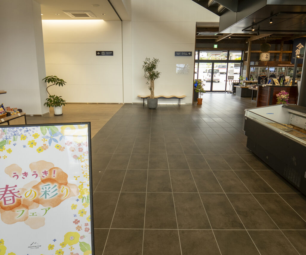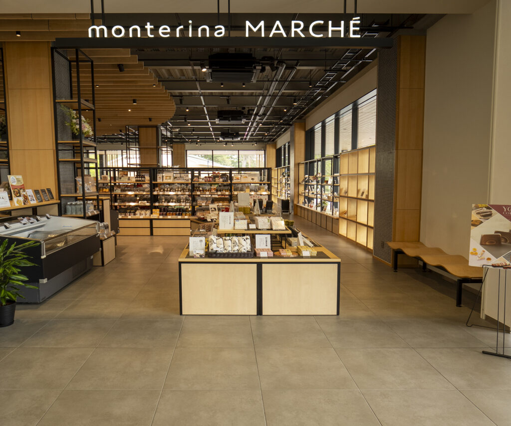 特産品の売り場である「monterina MARCHĒ」には、同じくナバラの色番D83が使用されています。控えめで自然なグレージュカラーで、安らげる店内を足元からつくり出しています。